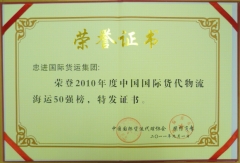 榮獲2010年度中國國際貨代物流海運50強