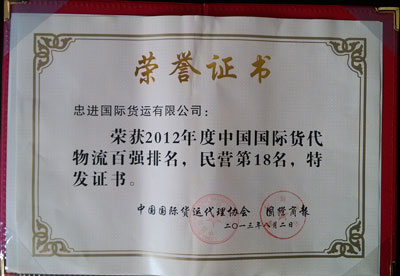 榮登2012年度中國國際貨代物流百強(qiáng)排名